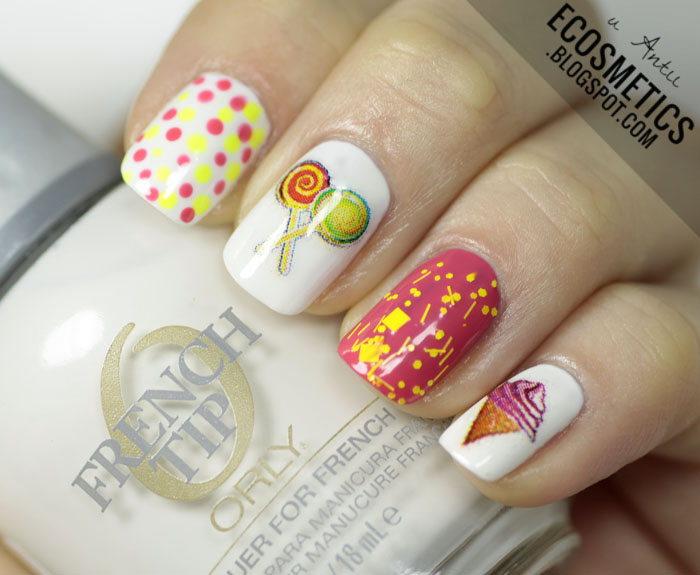 Lakier: biały marki Orly, żółty Glowstick, różowy Typografia B, fikuśny, żółty topper Golden Rose Carnival 14, sonda oraz NAKLEJKI-WODNE nr 17. Całość utrwaliłam Orly Polishield.